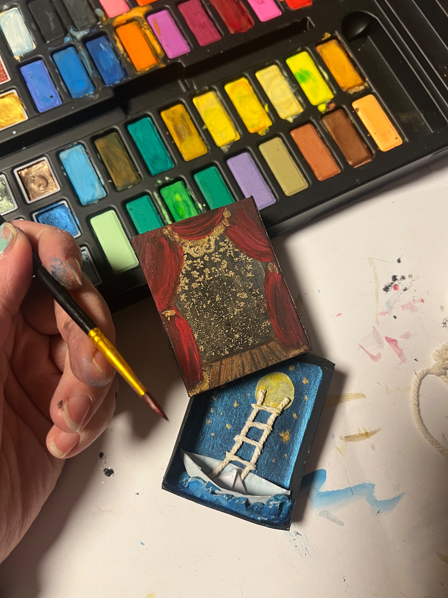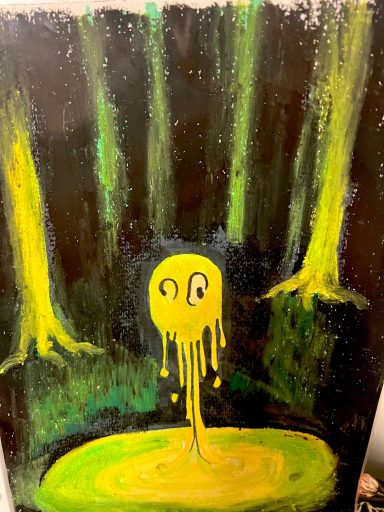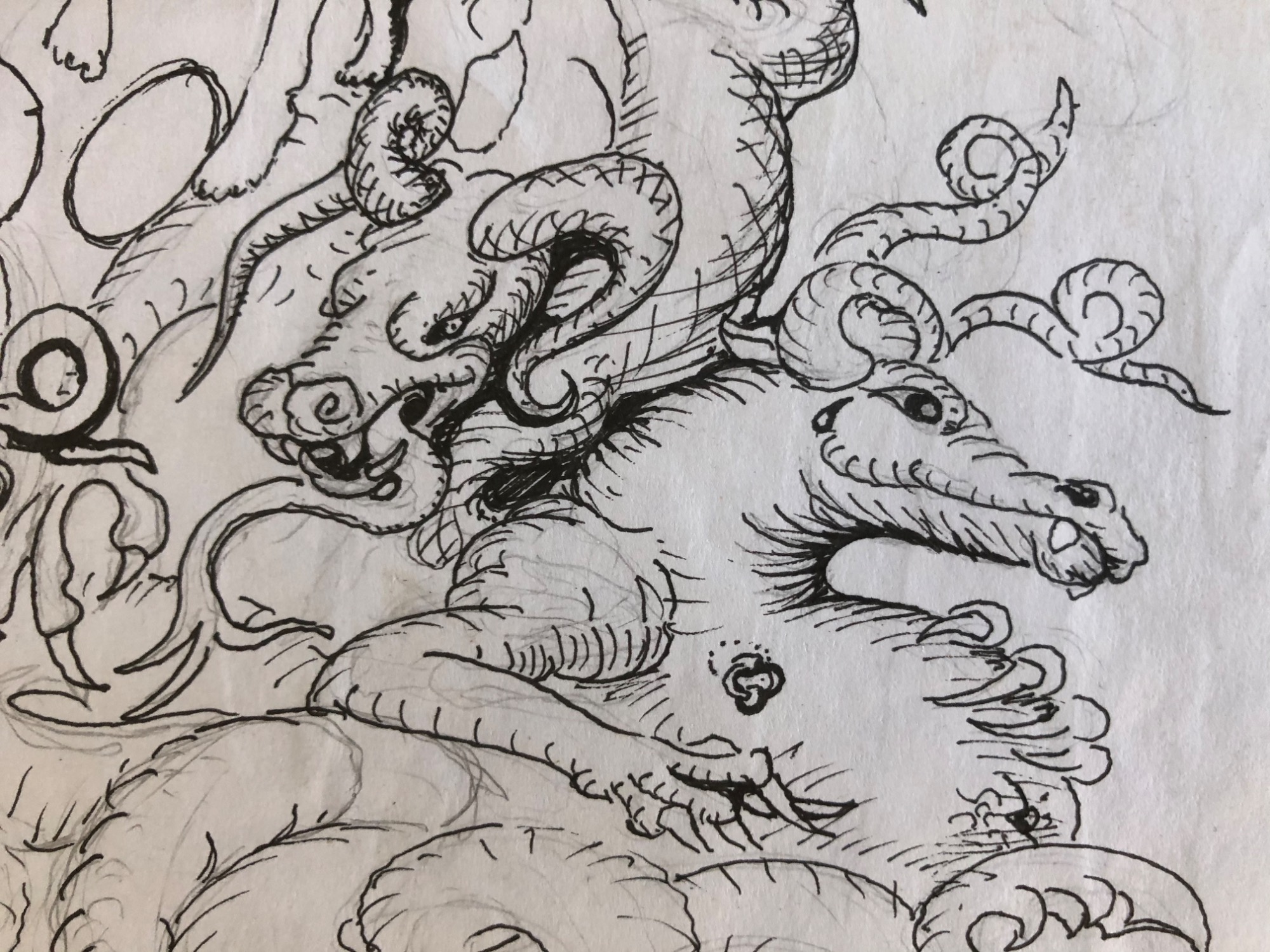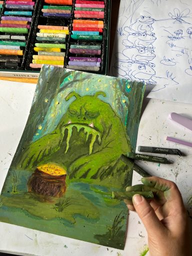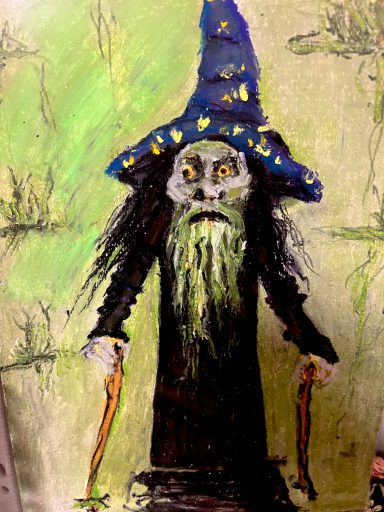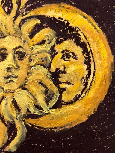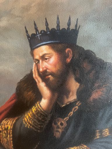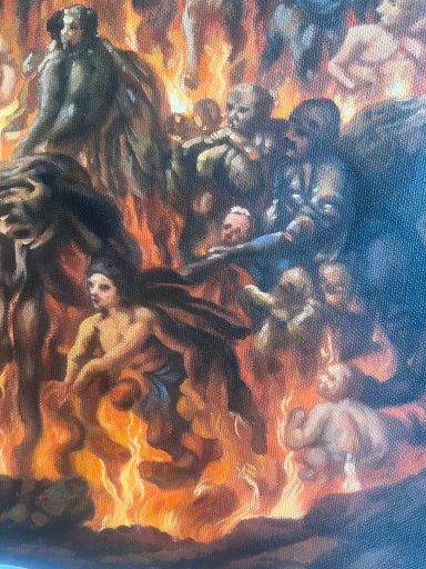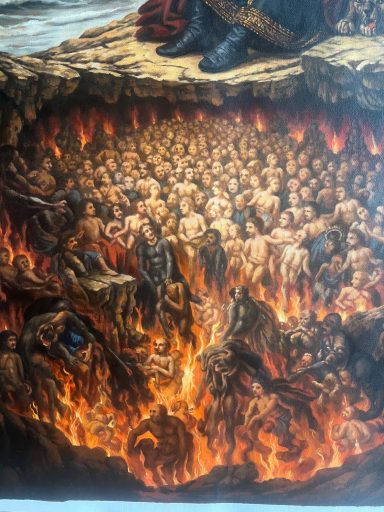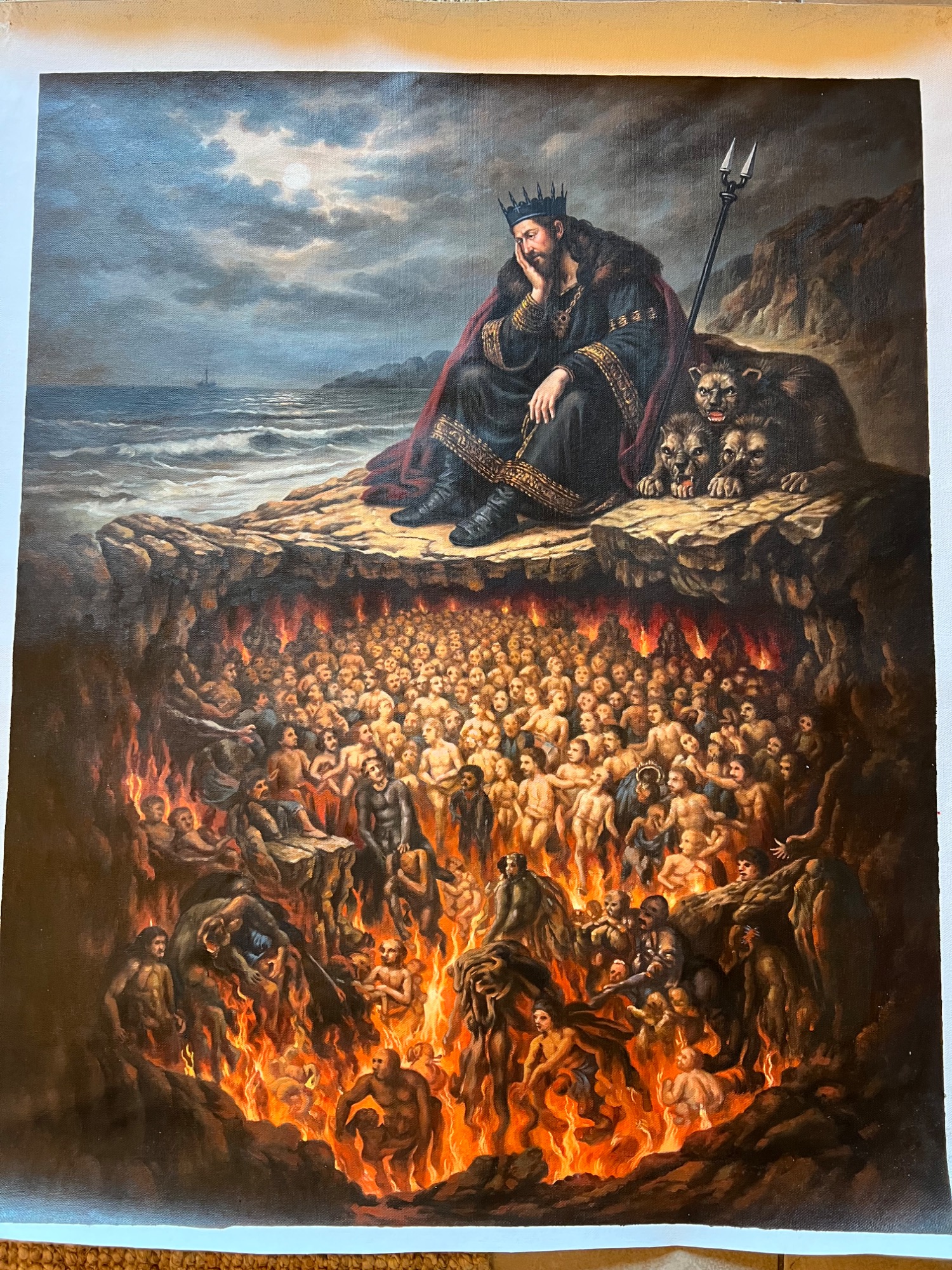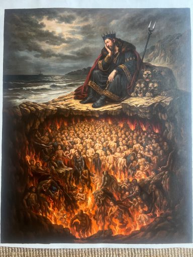 Seine Geste – das gestützte Kinn – verweist auf Erschöpfung und Sinnverlust. Die Unterwelt ist nicht mehr Ort der Konsequenz, sondern der Überfüllung. Eine zeitgenössische Allegorie auf menschliche Grausamkeit und moralische Erschöpfung: Eine Welt, in der selbst die Hölle keine Ordnung mehr schafft.