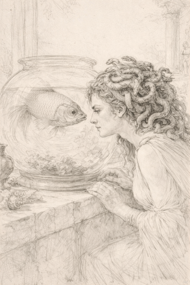 Hades, Fürst der Unterwelt, sitzt am Rand der Welt. Nicht richtend, nicht zürnend – sondern müde. Unter ihm stapeln sich die Seelen bis an die Decke der Hölle. Nicht, weil die Götter grausamer geworden wären, sondern weil der Mensch es wurde. Der dreiköpfige Hund schläft. Es gibt nichts mehr zu bewachen. Die Schuld kommt freiwillig.