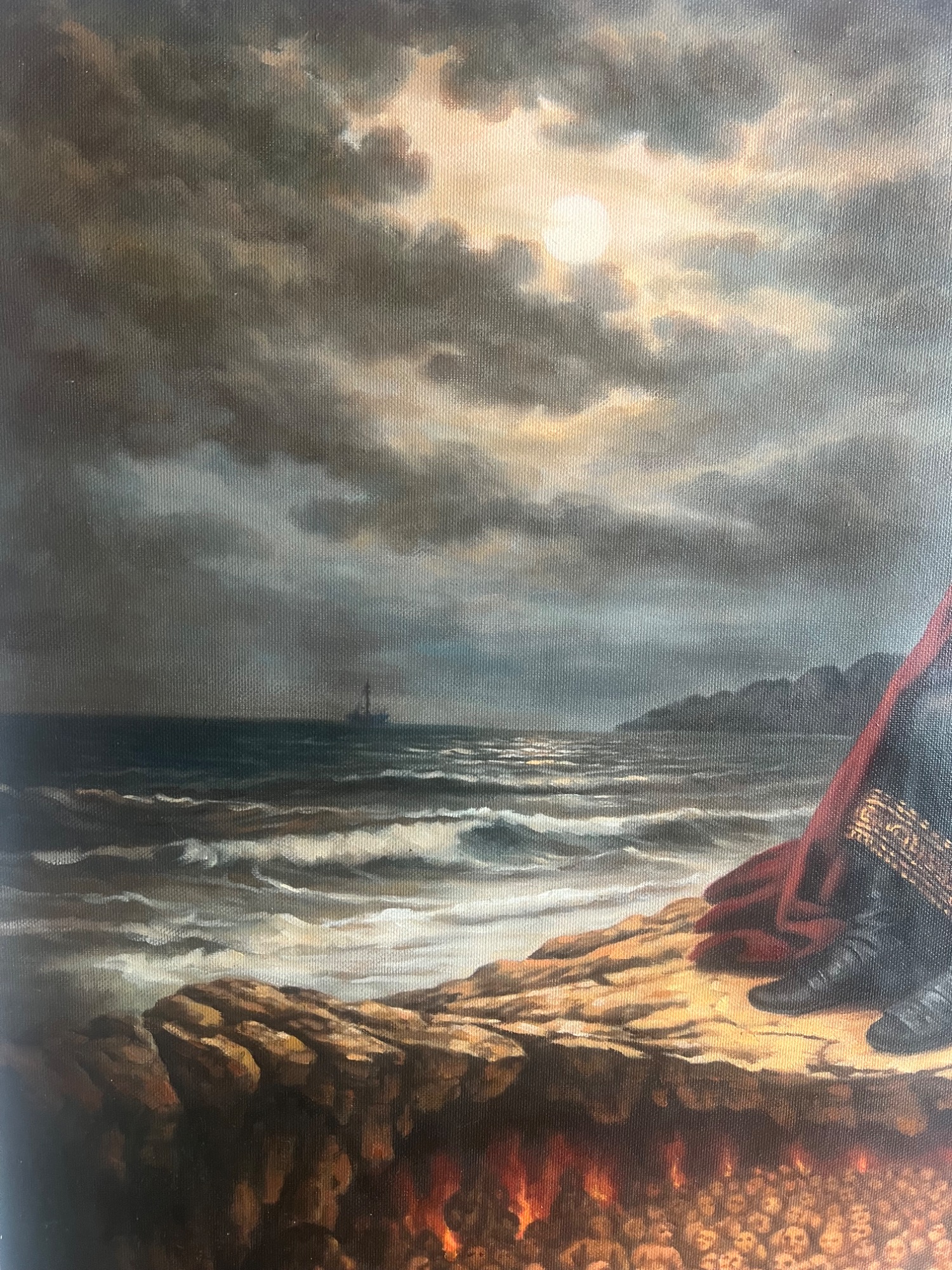 Das Meer vor ihm ist düster, aber frei. Die Erde unter ihm ist voll. Die Ordnung der Mythen hat kapituliert. Dieses Bild zeigt keine göttliche Strafe, sondern eine menschliche Bilanz. Selbst die Hölle ist am Limit.